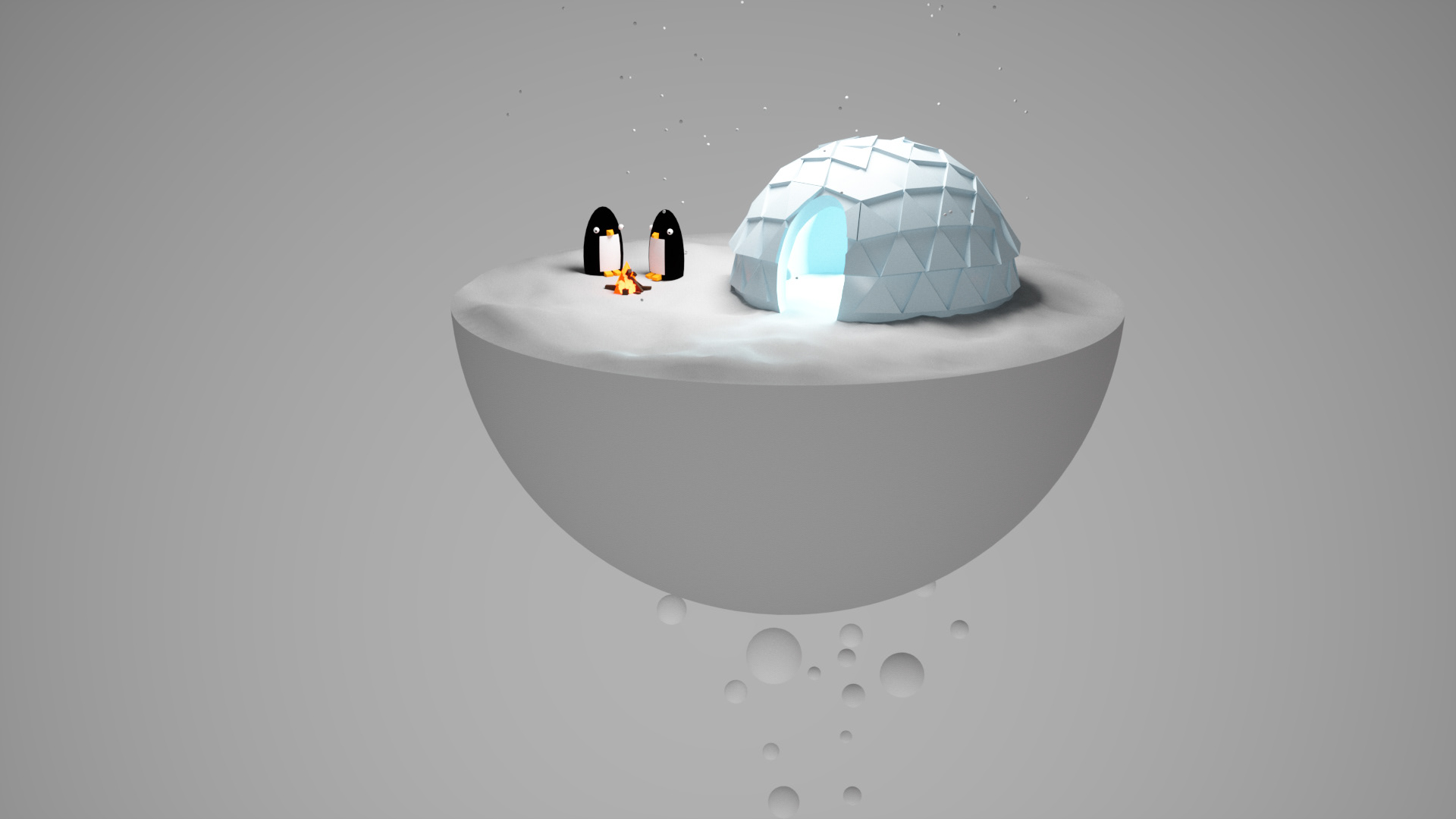 Die Igloo-Szene zeigt zwei Pinguine, die sich neben ihrem Iglu am Lagerfeuer aufwärmen. Hier basiert alles auf der Verwendung von unterschiedlichen geometrischen Formen. ©2018